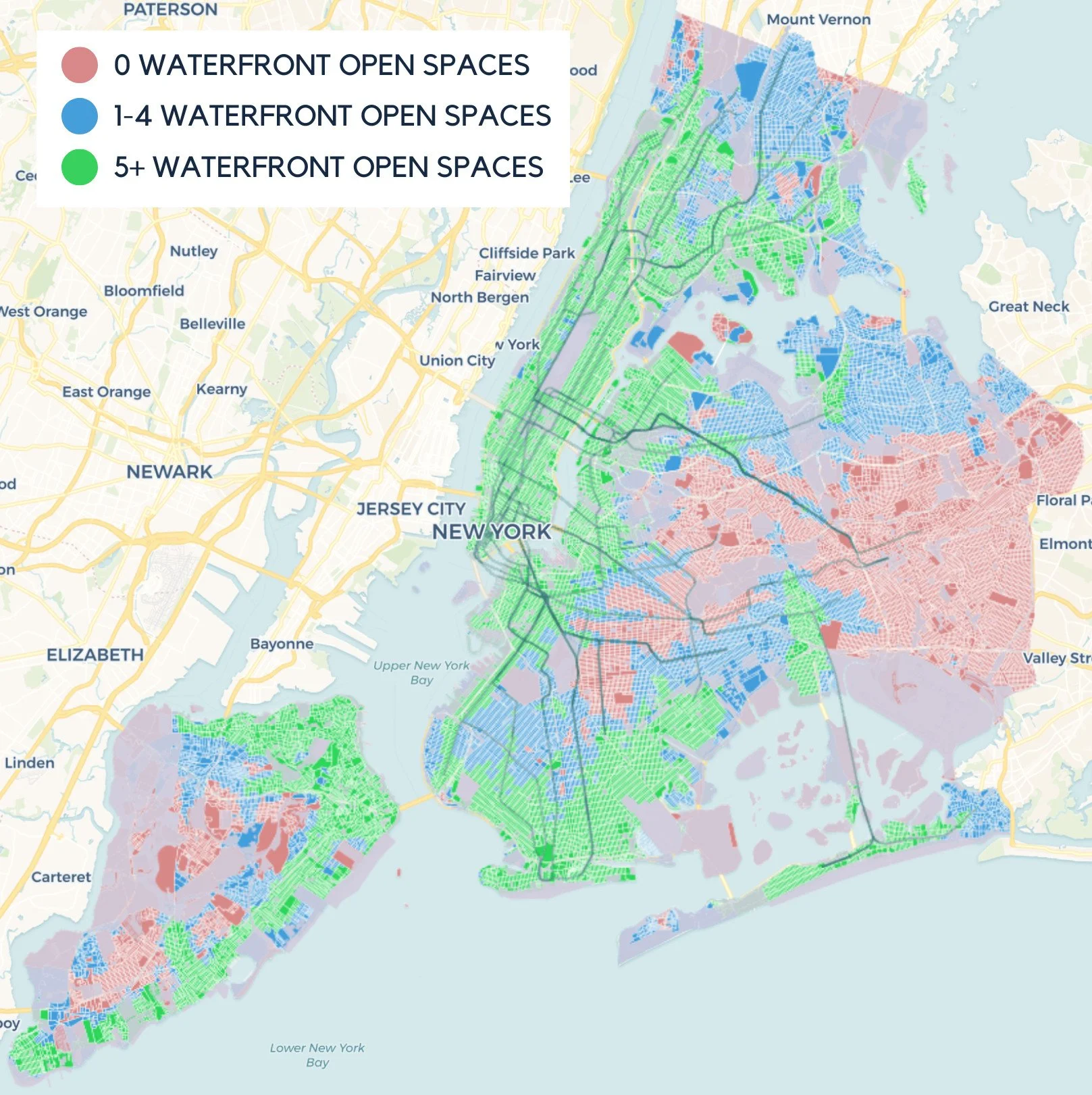 The largest gaps are in Southeast Queens where transit service and direct access to a NYC waterfront open space are limited.