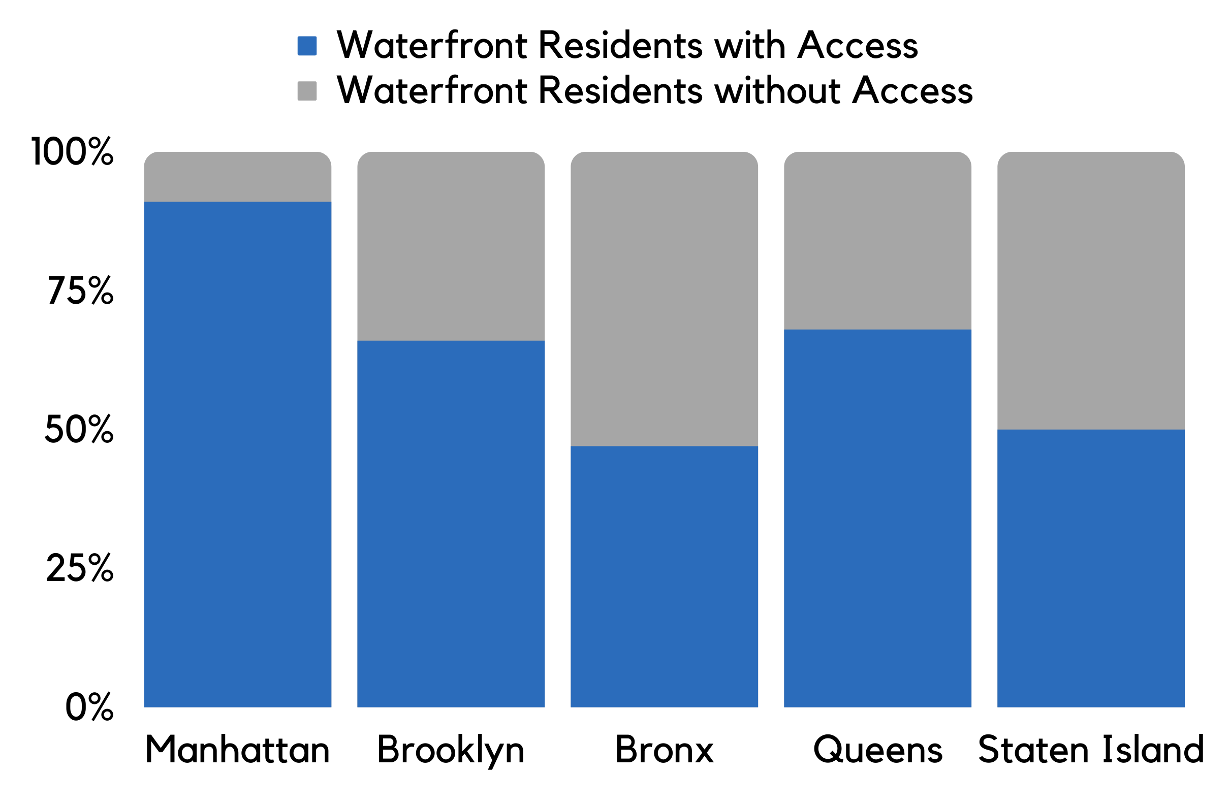 90% of Manhattan residents living within a half- mile of the waterfront have direct access to a waterfront open space, but fewer than half of Bronx residents within a half-mile of the waterfront can access it.